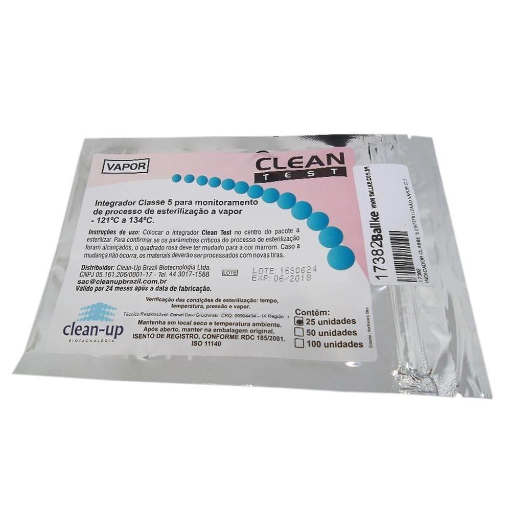 O integrador clean test possui uma tinta indicadora que muda de rosa para marrom e apresenta uma resposta integrada com os parâmetros críticos da esterilização: Vapor, tempo, temperatura e pressão. Proporciona uma leitura fácil e imediata, possui uma camada plástica que impede que a tinta do indicador entre em contato com os instrumentos esterilizados. É indicado para o Controle da Esterilização Higiene e Conservação: Manter sob temperatura ambiente (15 a 30 c) Manter em local com umidade controlada (entre 40 e 65%) Retirar da embalagem somente quando for utilizar o produto. Dados técnicos Marca: Clean Up Ciclos de 121°C, 128ºC e 134°C Isento de Chumbo Pacotes com 25 unidades Itens inclusos: 01 pacote Indicador classe 5 - 25 unidades clean test.