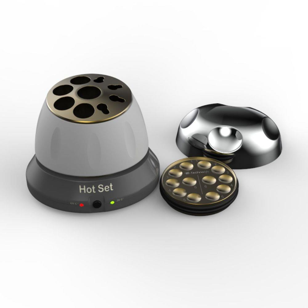 O aparelho Hot Set foi desenvolvido para aquecer Resinas compostas, Anestésicos e Facetas para os procedimentos de RTM. O HotSet aceita compósitos a partir de ponteiras de compressão ou de seringas de resina composta. Um bloco multifunção posicionado na parte superior do aquecedor, irá alojar o seu aplicador (pistola tipo Centrix) de composto e também a solução anestésica. Outro módulo consiste em um disco com disposição para acomodar 12 facetas.