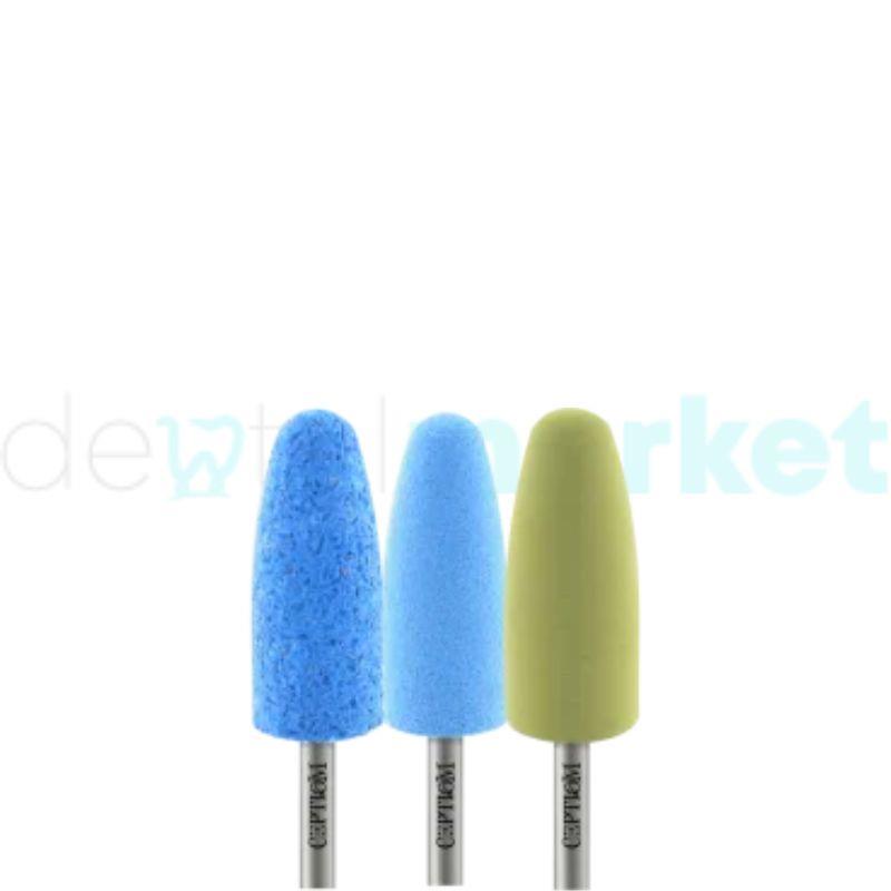 Kit Polidor Acrílico Blue Cônico Peça Reta com 3 Fases KPAB10.104.010 Indicado para nivelamento de acrílico. FIBER BLUE – PEÇA DE MÃO Novo abrasivo impregnado com fibra de vidro. Mais resistente nos procedimentos em acrílico e resinas soft. É recomendado o uso da fase amarela linha de polidores PA10.104F ou PA30.104F para o brilho final. Para melhores resultados é indicado respeitar as 3 fases. Rotação indicada: 5.000 a 10.000 RPM.