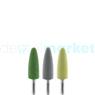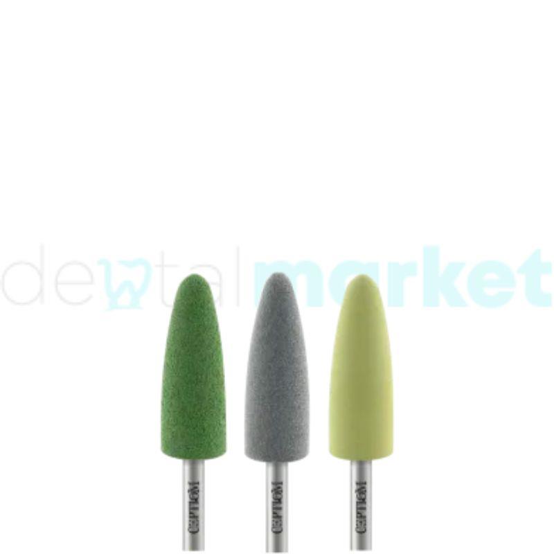 Kit Polidor Acrílico Cônico Peça Reta com 3 Fases KPA10.104.008 Indicado para nivelamento de acrílico. 1° Fase: Verde – Remove os riscos deixados pela fresa; 2° Fase: Cinza – Abre o brilho 3° Fase: Amarela – Brilho final