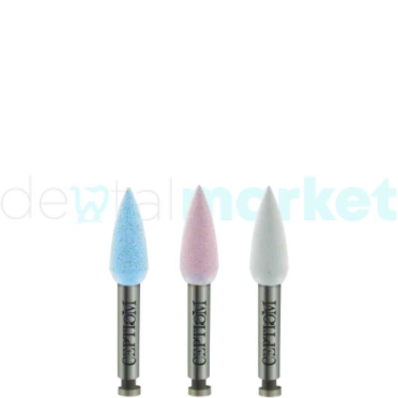 Kit Polidor Diamantado Foto'Cep Contra Ângulo com 3 Fases Chama KPDF30.204 Fabricação Alemã, impregnados com grãos de diamante natural, proporcionando desgastes, ajustes e polimentos com menor geração de calor, trepidação e alta qualidade de brilho. Dispensa o uso de pontas diamantadas e novas queimas de glaze. Extremamente resistentes. Foto’Cepti Polidores diamantados indicado para resinas fotopolimerizáveis. Excelente durabilidade e qualidade de brilho. Ideal para resinas nanoparticuladas. G Corte Grosso – Ajuste M Corte Médio – Remove riscos e abre brilho F Corte Fino – Glaze Zirkon’Fast Linha de Polidores com a maior concentração de grânulos de diamante natural disponível no mercado mundial. Fabricado originalmente para desgaste e brilho em zircônia, a família Zirkon’Fast é altamente resistente e abrasiva em sua fase de ajuste, tornando-se a linha de abrasivos como menor índice de aquecimento também em dissilicato de lítio (E-max) e demais cerâmicas. Sua incrível durabilidade segurança e alto poder de brilho, coloca a Zirkon’Fast como a mais avançada linha de polidores para zircônia/cerâmica e cerâmica prensada existente atualmente no mercado. G Corte Grosso – Ajuste M Corte Médio – Remove riscos e abre brilho F Corte Fino – Glaze Cepti’Ceram Polidores diamantados indicados para dissilicato de litio e cerâmicas. Cepti’Ceramé uma linha um pouco mais macia quando comparado à Zirkon’Fast, ideal para os profissionais que buscam conforto e segurança, principalmente em ajustes em bordos cervicais. G Corte Grosso – Ajuste M Corte Médio – Remove riscos e abre brilho F Corte Fino – Glaze Rotação indicada: 5.000 a 10.000 RPM.