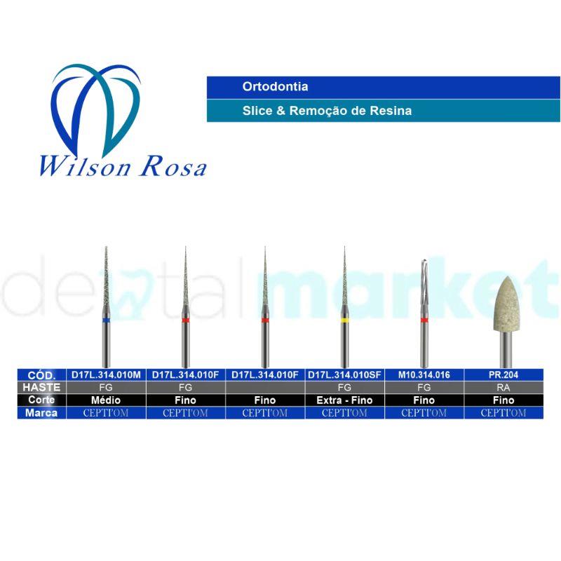 Kit Remoção e de Resina e Slice - Wilson Rosa Elaborado pelo professor Dr Wilson Rosa, com os seguintes ítens: D17L.314.010M – Ponta diamantada ultra fina, em lança granulação média; D17L.314.010F – 2 Pontas diamantadas ultra finas, em lança granulação fina; D17L.314.010SF – Ponta diamantada ultra fina, em lança granulação extra fina; CR20.314.023 – Ponta com 6 lâminas para remoção de excesso de renisa ortodôntica; PR30.204 – Abrasivo para remoção final de resina ortodôntica sem prejudicar estrutura dentária; M10.314.016