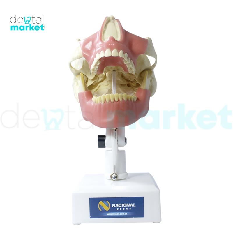 Manequim com Todos os Dentes e Gengiva - Nacional Ossos Este manequim fabricado pela Nacional Ossos é um corte transversal do crânio ,com propriedades mecânicas semelhantes ao osso humano ( tipo 2 ) com maxila e mandíbula com todos os dentes e revestidas de material que simula tecido mole, possibilitando incisão, descolamento e sutura. A Maxila possui seio maxilar com membrana flexível, atm, zigomático, auricular e occipital ideal para estudos, praticas de cirúrgias odontologicas e hands-on, podendo ser cortado e perfurado. Possibilita ao profissional ter um treinamento muito próximo do real, aprimorando técnicas com respeito á Bioética. O suporte permite fazer todos os movimentos necessários de abertura de boca, tombamento e fechamento para o aluno trabalhar com as duas mãos como no paciente real. MATERIAL: - Poliuretano Rigido. - Silicone alta resistência ao rasgo. COMPOSIÇÃO 4(quatro) peças: - MAXILA (4016 gt). - MANDIBULA (4013 GT). - BLOCO DE POLIURETANO SIMULANDO MATERIAL ÓSSEO EXTRA ORAL. - SUPORTE PARA MANEQUIM (COD 4020). TIPO DO MODELO : INTACTO X FRATURADO DEFORMIDADE RADIOPACO LIGAMENTOS DEMONSTRATIVO ARQUIVO DIGITAL OUTROS PROCEDIMENTO INDICADOS: - Área doadora de ramo ou de mento (tomando muito cuidado com o nervo mandibular). - Lateralização do nervo mandibular bi lateral para colocação de um implante. - Levantamento de seio bi lat