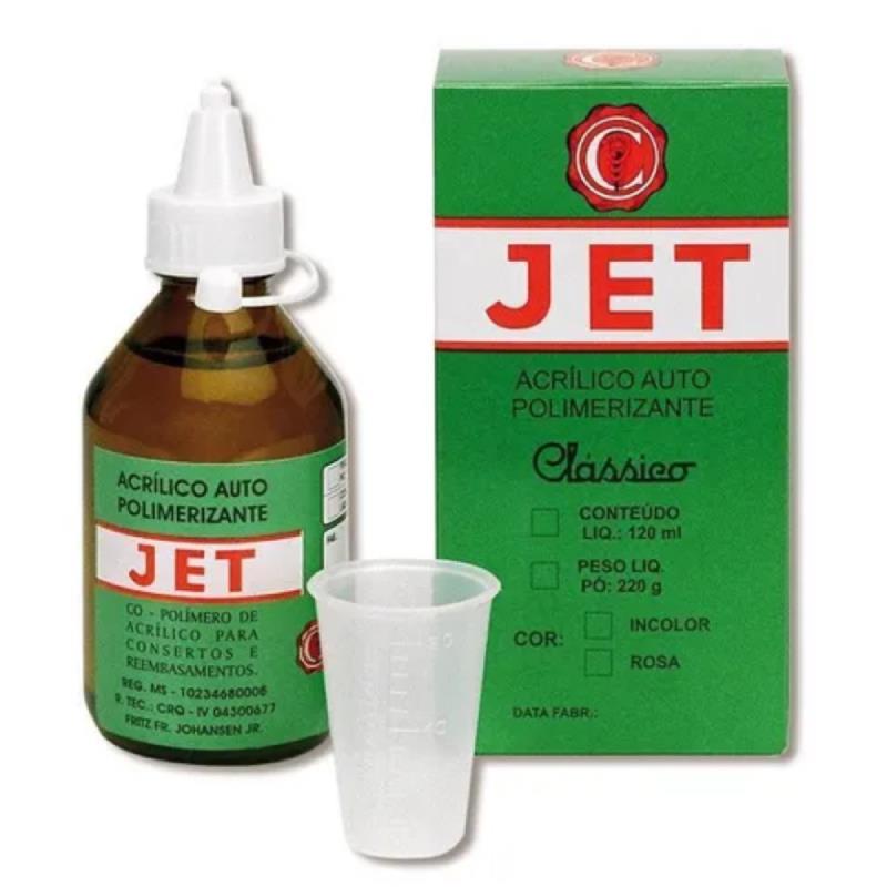 Indicação: Indicado para consertos e reembasamentos. Descrição: Acrílico auto polimerizante (rápida) para consertos e reembasamentos. Modo de usar: A peça a ser consertada ou reembasada deve ser pré-preparada, estar limpa e isenta de gordura Proporção em volume - 2,5 partes do polímero x 1,0 do liquido. Faça a mistura em um pote colocando primeiro o líquido depois o pó, espatulando pouco e distribuindo na peça Composição Resina (pó): Polimetilmetacrilato Peróxido de benzoíla Pigmentos biocompatíveis Líquido: Monômero de metilmetacrilato Inibidor Dmt Tempo de reação À temperatura ambiente próxima de 25 graus, a reação se dá em cerca de 10 minutos